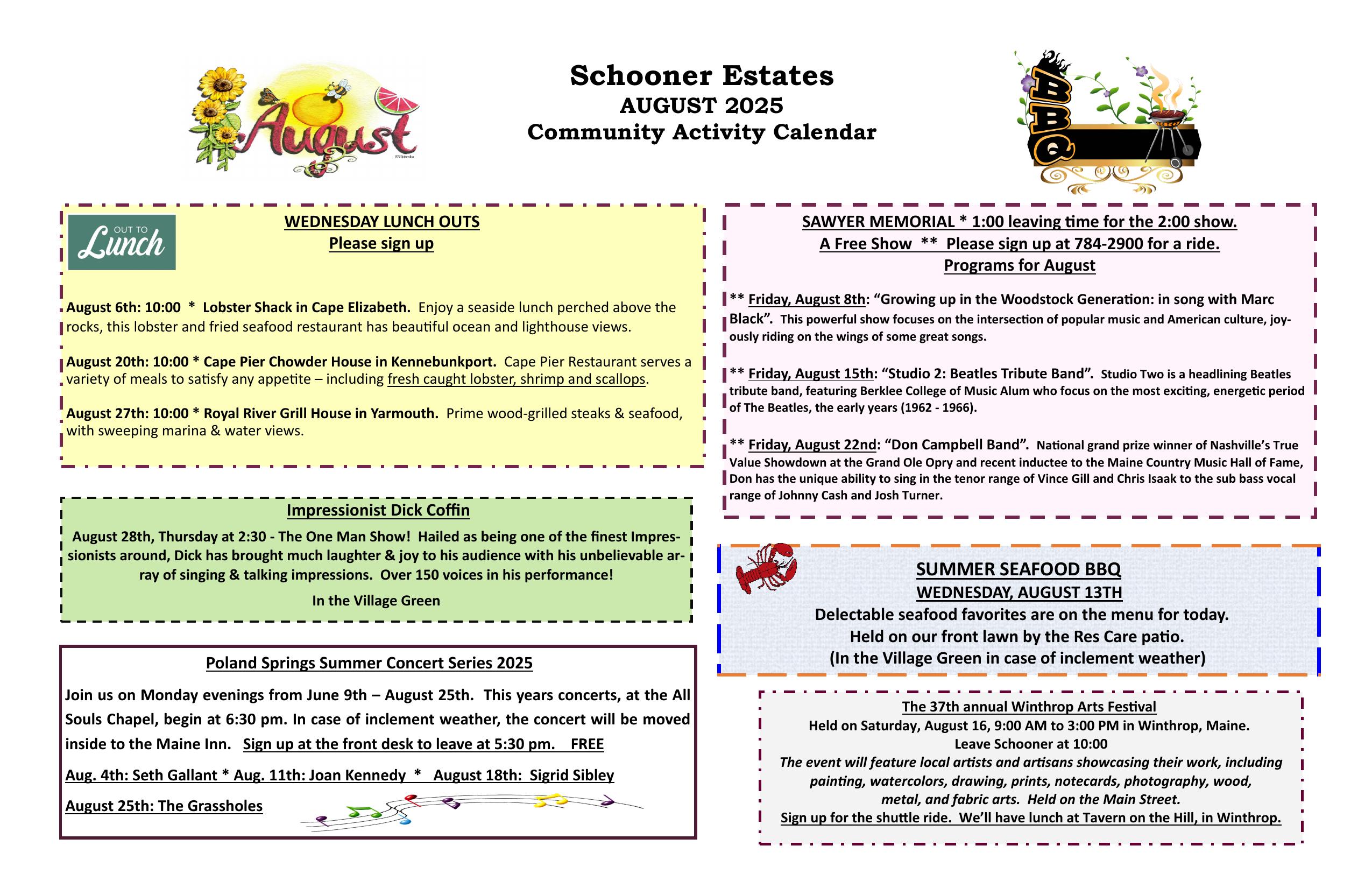 - 10:00 AM: Lunch Out: Cape Pier Chowder House in Kennebunkport (Sign Up)